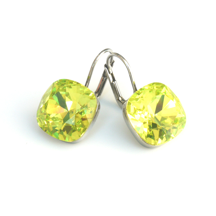 Single square crystals, approximately 1cm across in a stunning lime green. A truly gorgeous style and colour that is perfect for wearing everyday for a special occasion. The silver plated settings are hypo-allergenic and there are many more colours in stock!